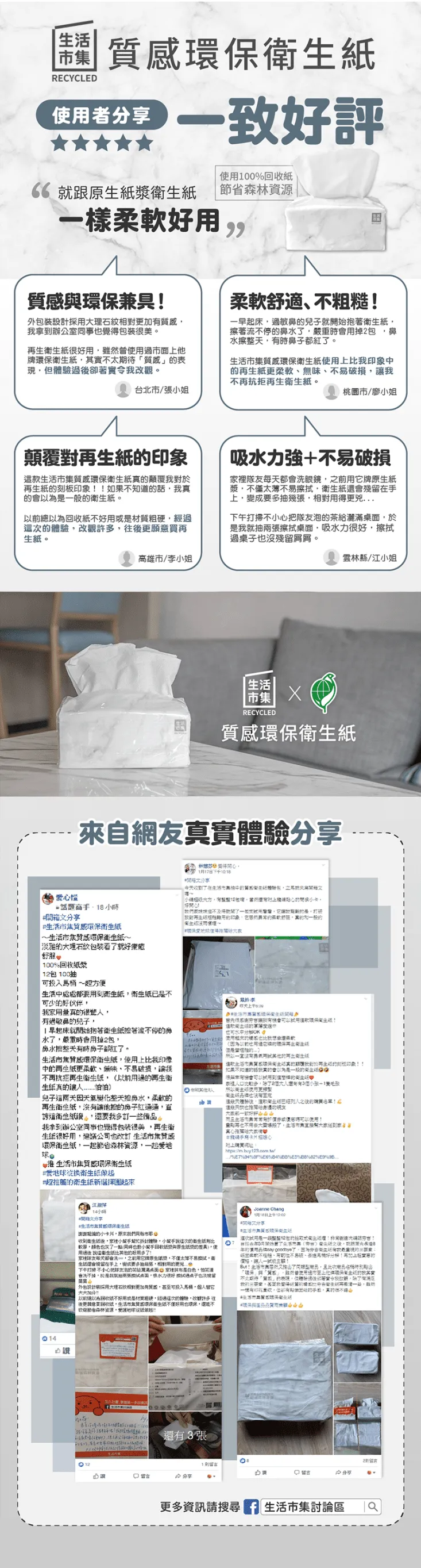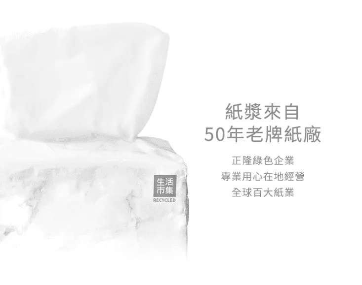 【規格】品牌:生活市集尺寸:195×190mm(CNS許可差±5%)抽數/長度/重量:100抽層數:2層產地:台灣材質/成份:100%回收紙漿總效期:五年包裝內容物:14包x6串/箱可碎裂於水中