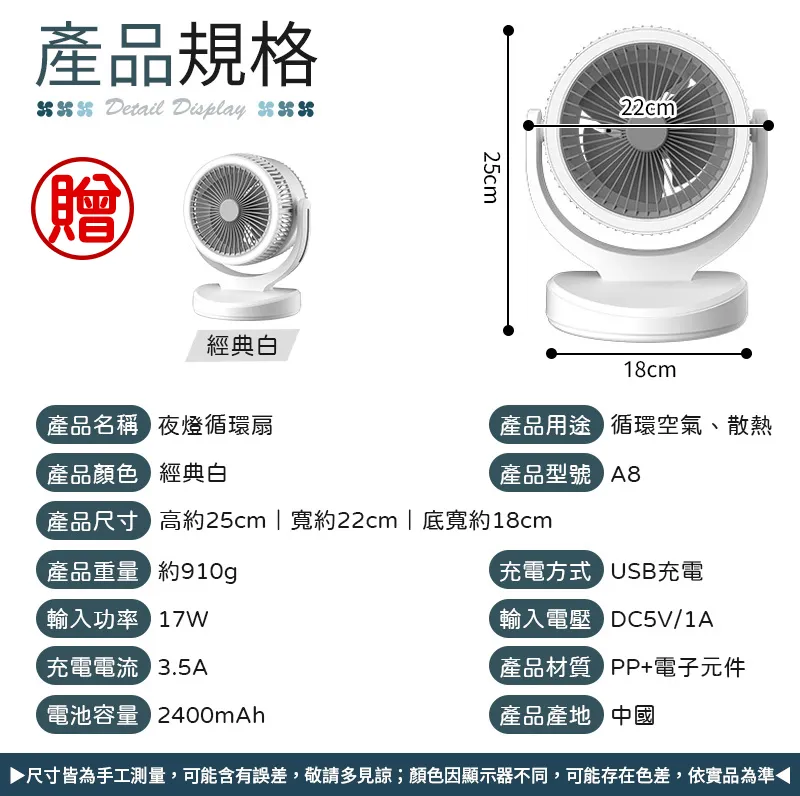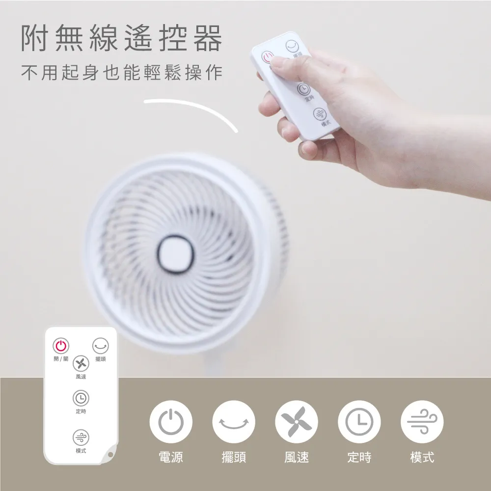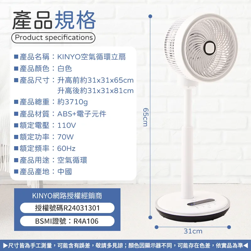 包裝內容物 : KINYO空氣循環立扇x1、遙控器X1、說明書x1、 (贈品)夜燈循環扇x1
