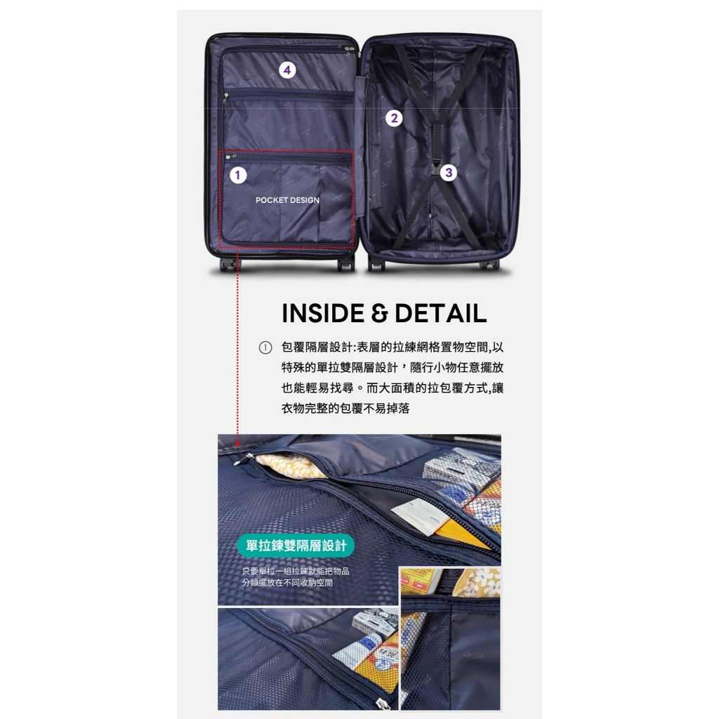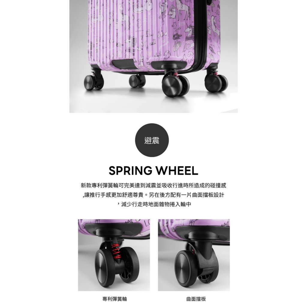 商品配件:新款專利彈簧輪、TSA海關密碼鎖、全新前置行李掛勾、鋁合金強化護角、摩砂紋PC消光材質