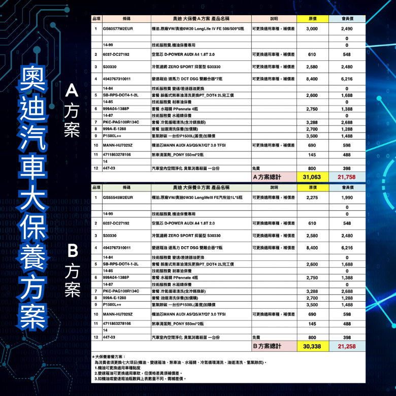 【VIP方案】進口車系-大保養-奧迪汽車B方案。(消費積點:40)