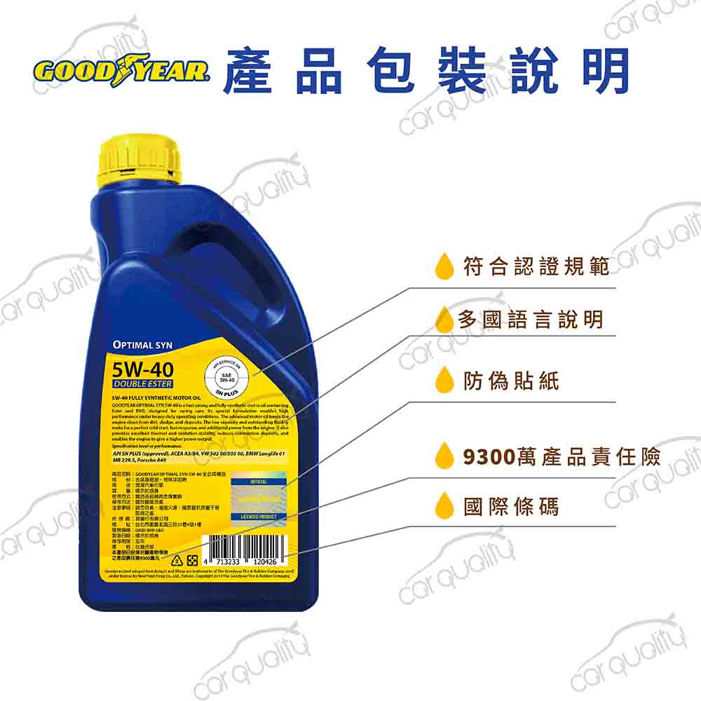 TOYOTA【固特異 GOODYEAR】機油套餐 5W40 雙酯 OPTIMAL 1L*4 完工價