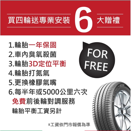 輪胎四入贈送一年保固 及 德國四輪定位,加入客服了解更多優惠!