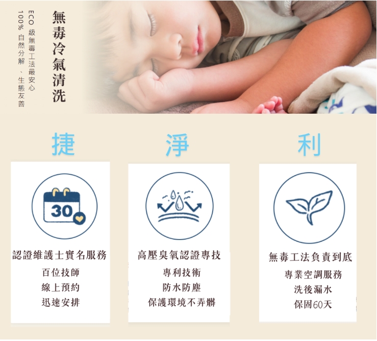 提供冷氣清洗保固30天:限清洗後機組功能保固(髒汙除外),凡因我方清洗疏失所造成的機器損壞情形,公司將派員協助處理。